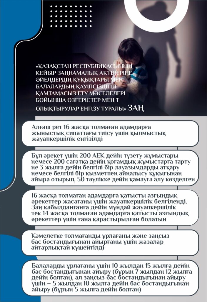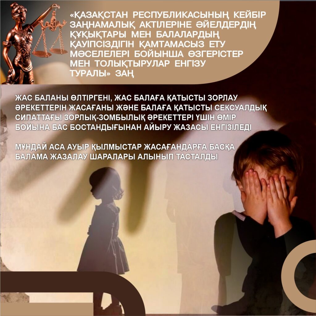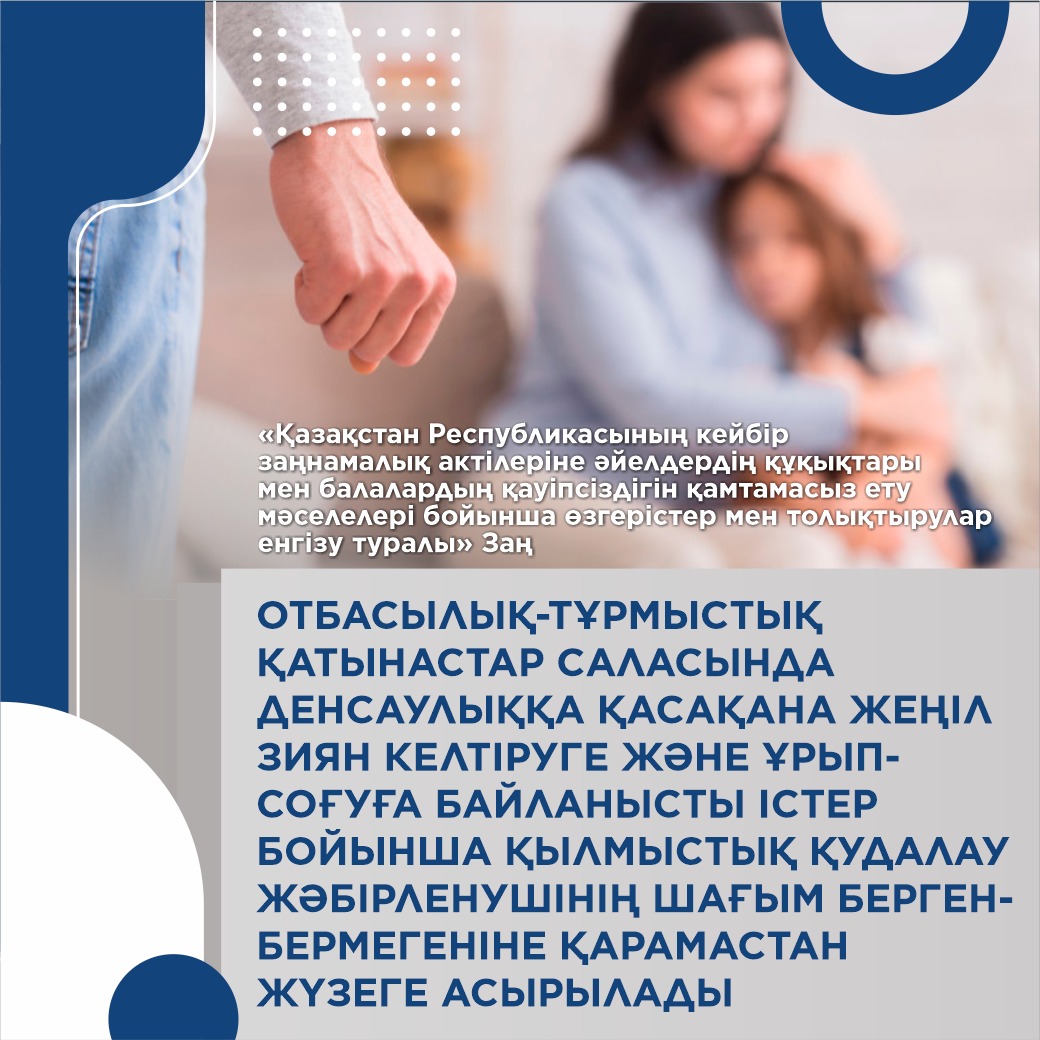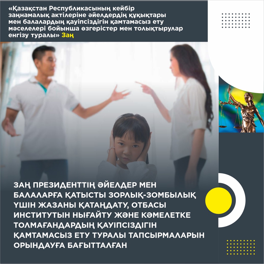 Мемлекет басшысы 2022 жылғы 16 наурыздағы және 2023 жылғы 1 қыркүйектегі Қазақстан халқына арнаған жолдауларында әйелдер мен балаларға қатысты зорлық-зомбылық үшін жазаны қатаңдатуды тапсырғанын еске сала кетейік.