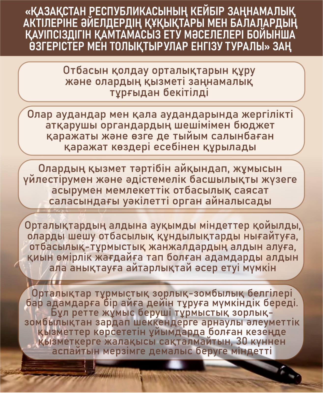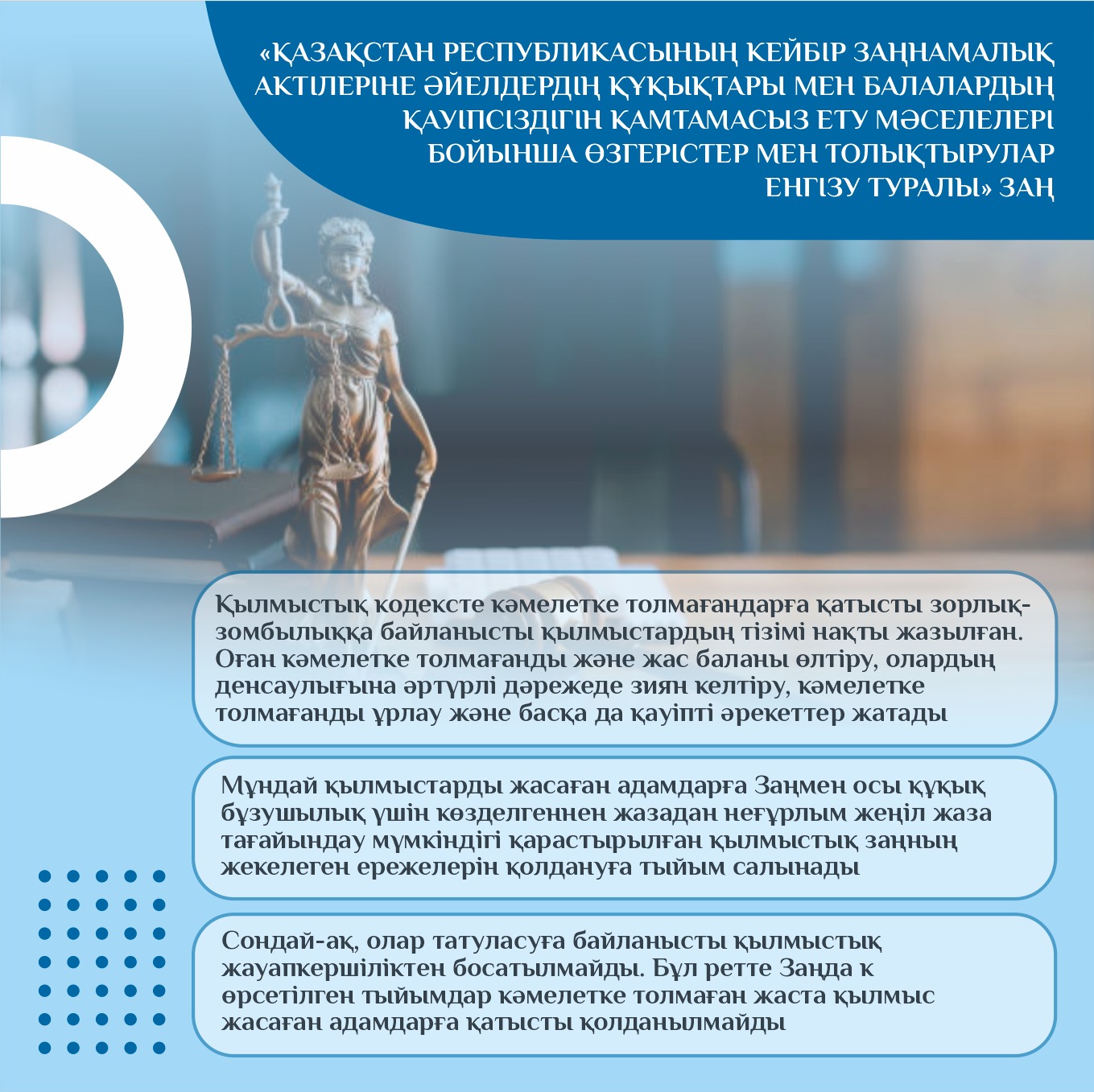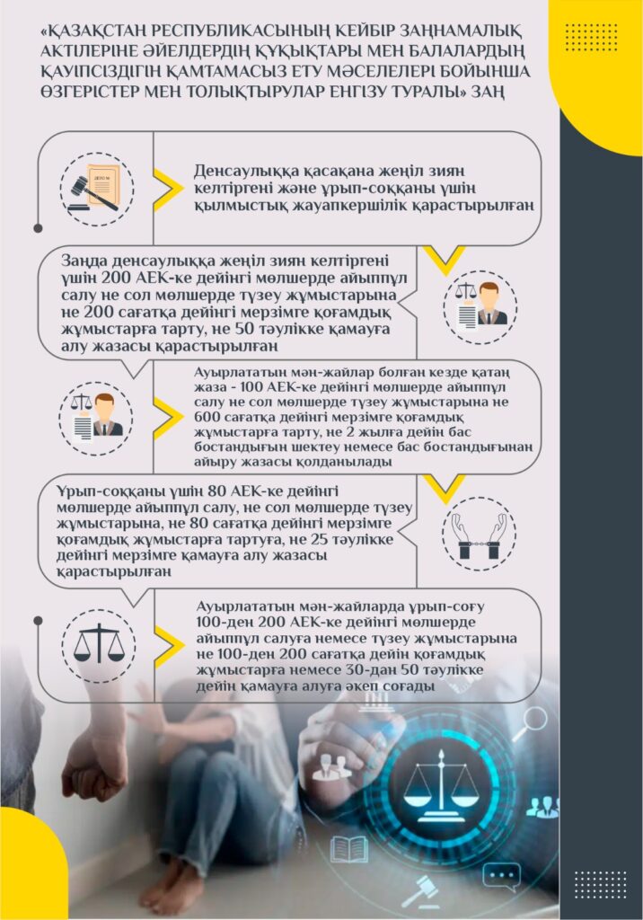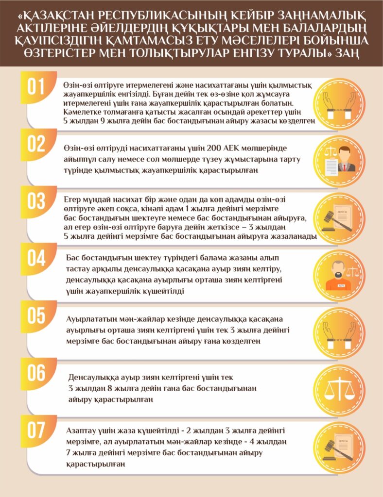 Мемлекет басшысы 2022 жылғы 16 наурыздағы және 2023 жылғы 1 қыркүйектегі Қазақстан халқына арнаған жолдауларында әйелдер мен балаларға қатысты зорлық-зомбылық үшін жазаны қатаңдатуды тапсырғанын еске сала кетейік.